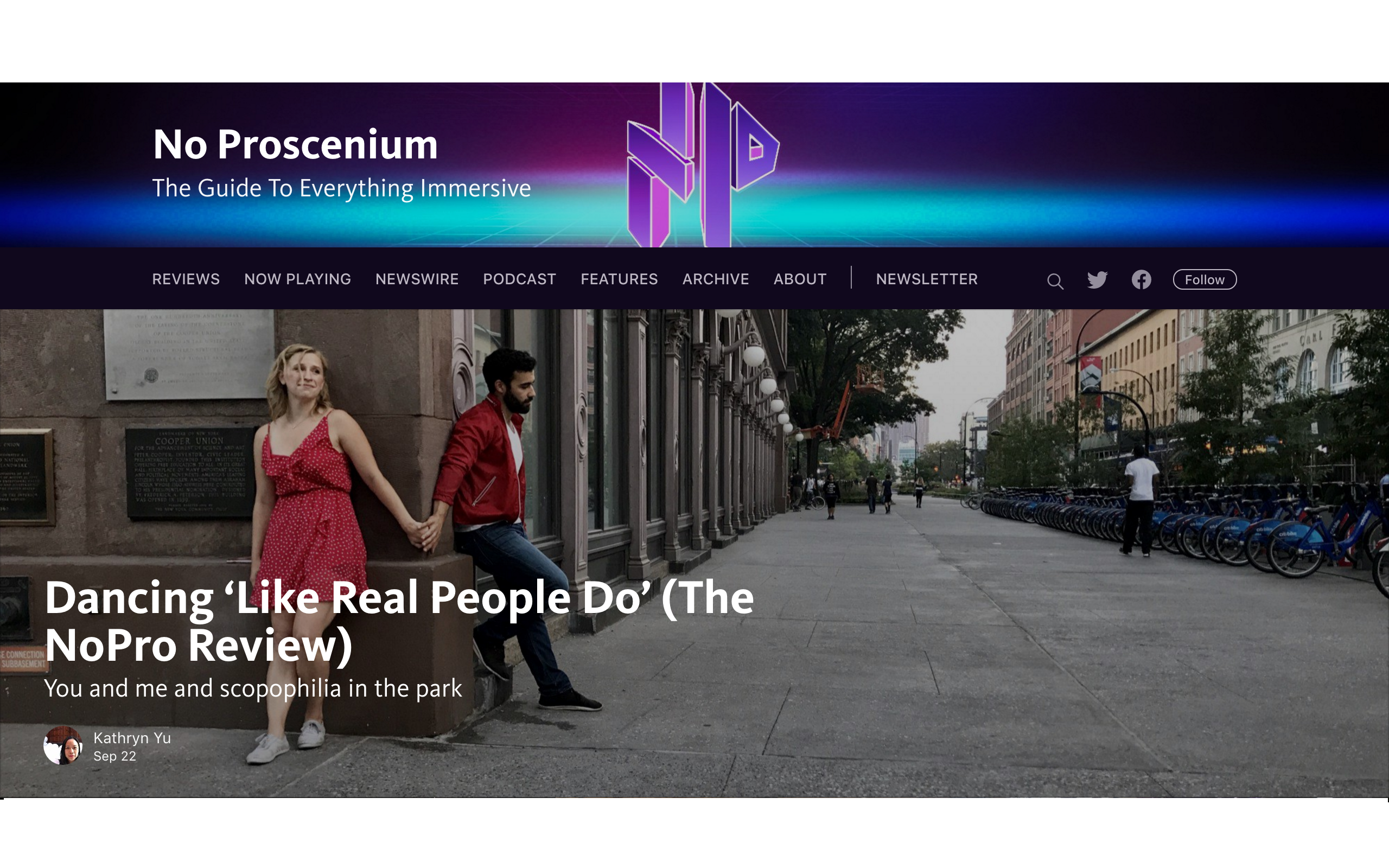 Read the article by Zay Asbury of immersive theatre site No Proscenium who speaks of New York and Like Real People Do "they kissed with all the desperation of two people trying to force intimacy out of broken hearts" www.NoProscenium.com